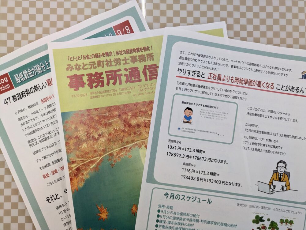 2025年10月 社長さん、経営者として続けていることは何ですか? 2025.10.07 おすすめ記事 社長さん、経営者として続けていることは何ですか? おすすめ記事 | 2025.10.07 去年、労基署の調査を受けていたら、これ忘れないで! 2025.10.06 おすすめ記事 去年、労基署の調査を受けていたら、これ忘れないで! おすすめ記事 | 2025.10.06 ワークライフバランスを捨てられるのは、どなた? 2025.10.05 おすすめ記事 ワークライフバランスを捨てられるのは、どなた? おすすめ記事 | 2025.10.05 育児休業給付金の返金事例が急増中!注意すべきこととは? 2025.10.04 おすすめ記事 育児休業給付金の返金事例が急増中!注意すべきこととは? おすすめ記事 | 2025.10.04 能力不足で解雇はできるのか? 2025.10.03 おすすめ記事 能力不足で解雇はできるのか? おすすめ記事 | 2025.10.03 健康診断の再検査は、労働時間になるの? 2025.10.02 おすすめ記事 健康診断の再検査は、労働時間になるの? おすすめ記事 | 2025.10.02 事務所通信10月号、発行しました! 2025.10.01 おすすめ記事 事務所通信10月号、発行しました! おすすめ記事 | 2025.10.01